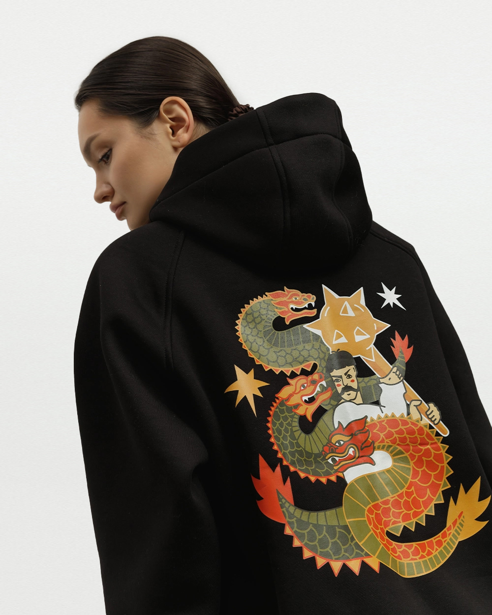 Додайте у свій гардероб дух української епічності! Це худі — не просто одяг, а сучасний переказ історії Котигорошка, героя, який завжди долає труднощі. На грудях — невеликий надпис, а на спині оживає яскрава сцена перемоги над триголовим змієм. Цей дизайн нагадує: кожен з нас має силу, щоб здолати своїх "зміїв". Виготовлене з якісного, м'якого трикотажу, який має гарну зносостійкість і довгий термін експлуатації, стійкий до деформації, поверхня не скочується, повітропроникний - дозволяє тілу дихати.